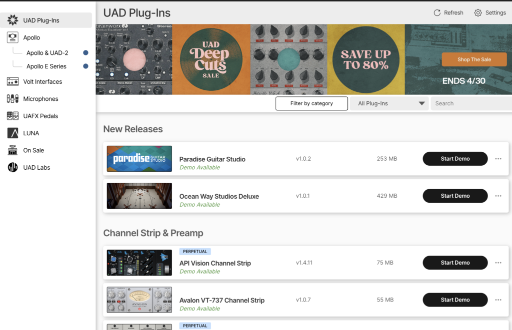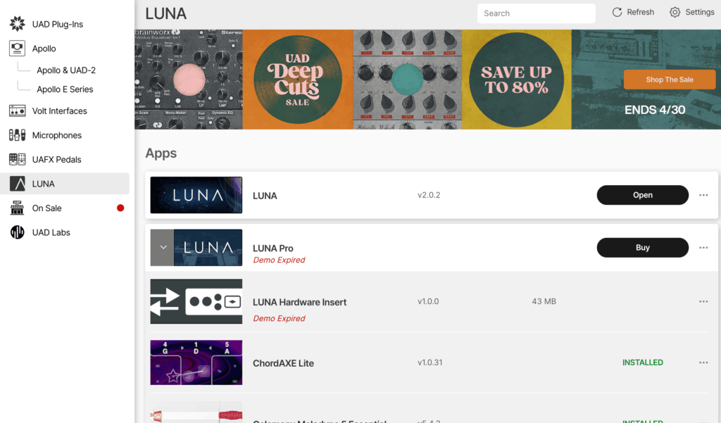 かつてのUA製品はブラウザからダウンロードすることが多かったのですが、今はLUNAもプラグインも音源も、全てこのUA Connectというアプリの中で一括管理するようになっています。