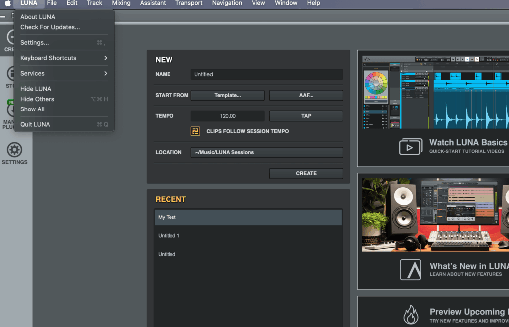 まずは画面左上にあるLUNAのロゴをクリックして、Settings(環境設定)を開きましょう。 その中にあるHardware(ハードウェア)というタブが、今回のメインステージになります。